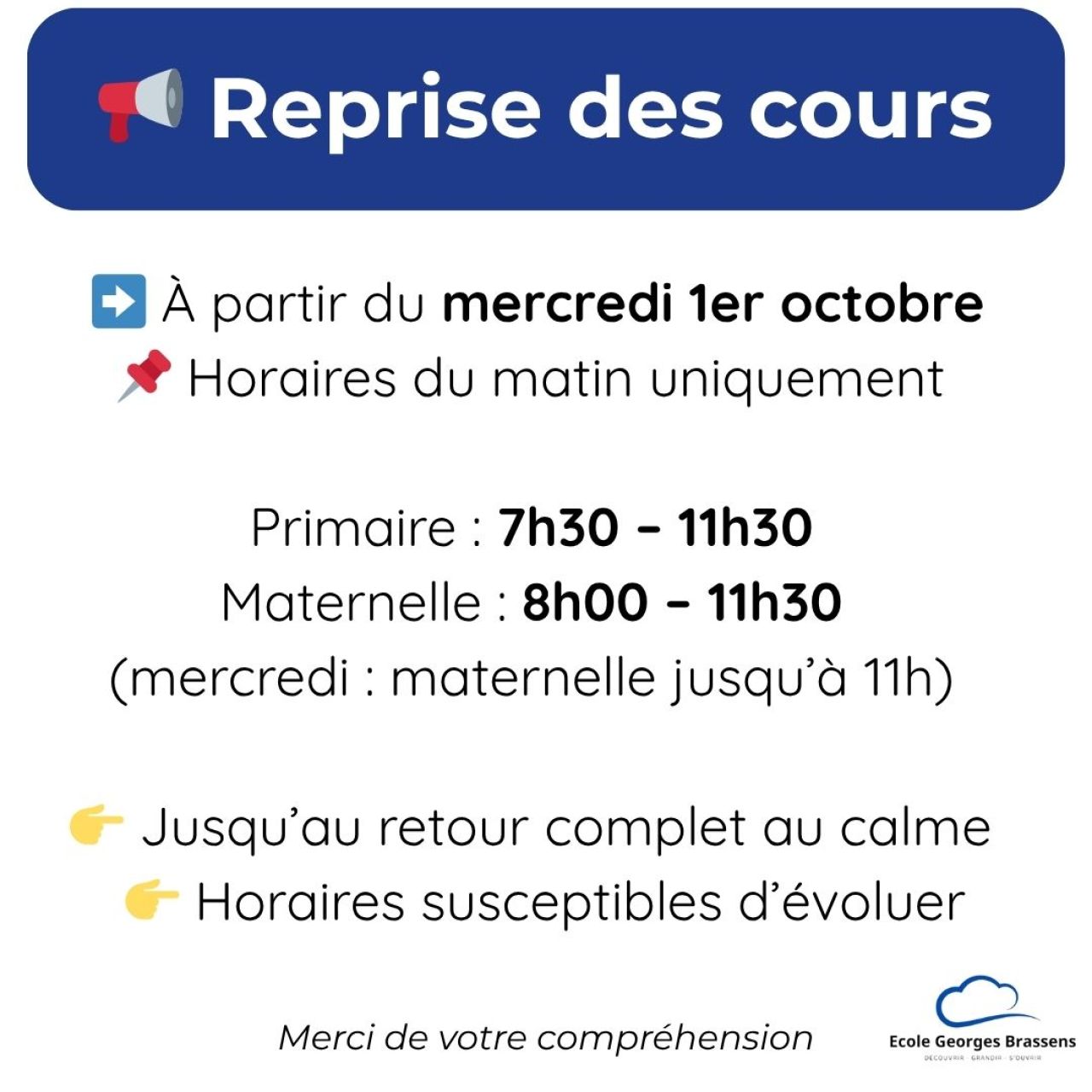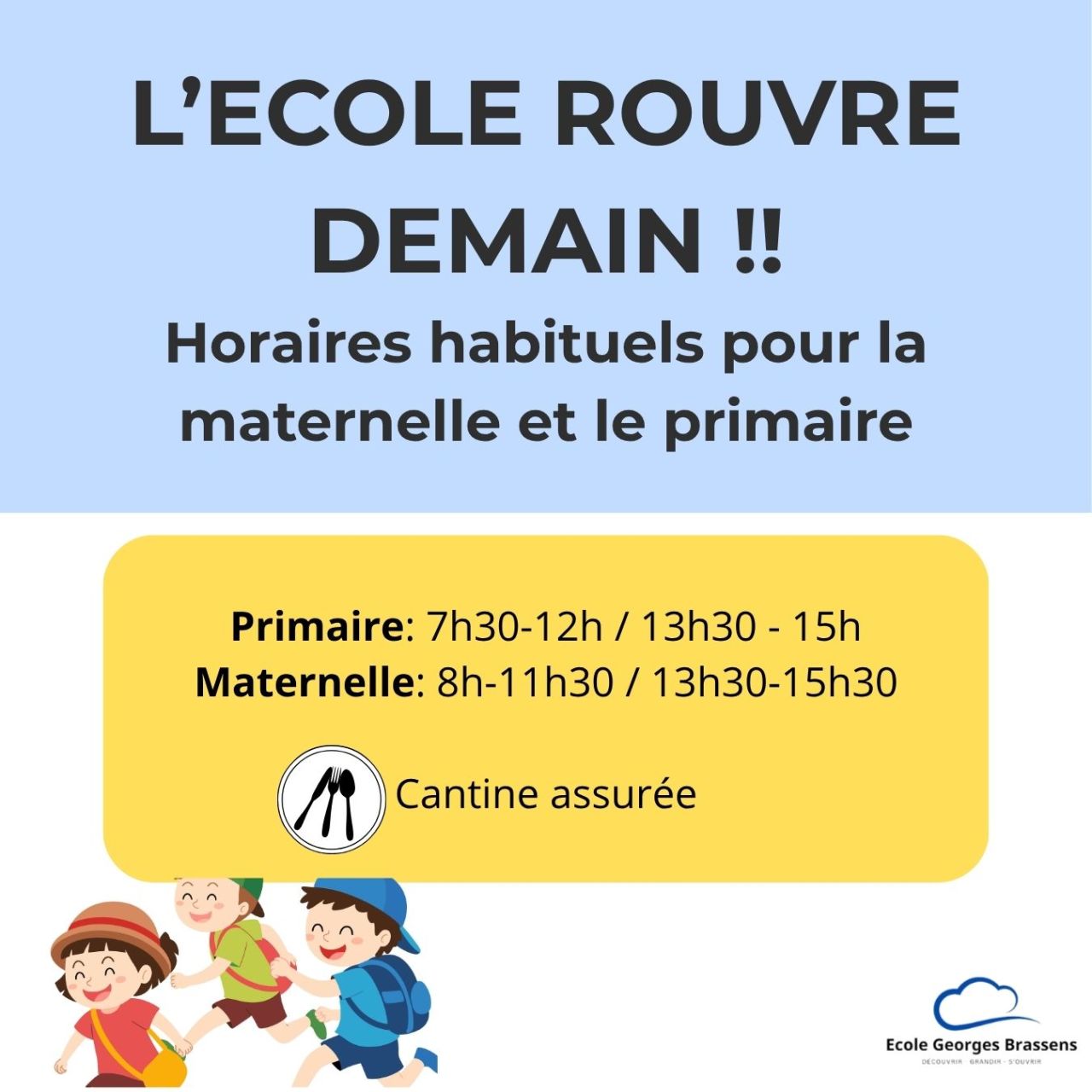 Nous vous informons que l’école ouvrira ses portes demain aux horaires habituels :