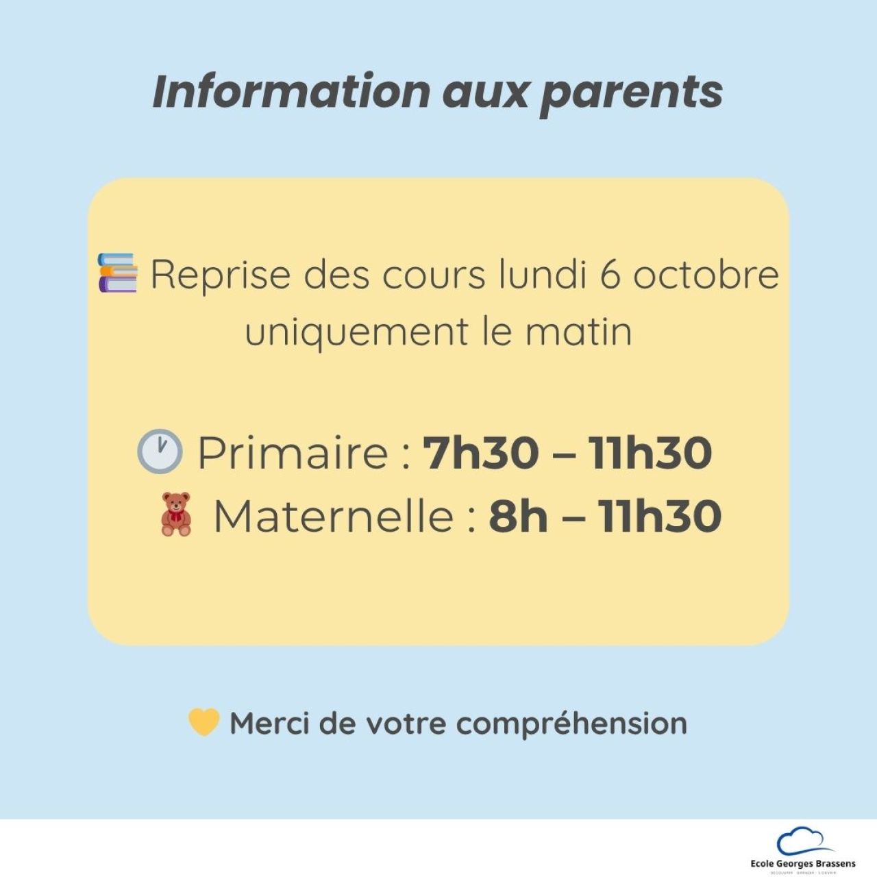 Nous vous informons qu’il y aura classe demain, lundi 6 octobre, uniquement le matin.