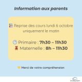 Nous vous informons qu’il y aura classe demain, lundi 6 octobre, uniquement le matin.